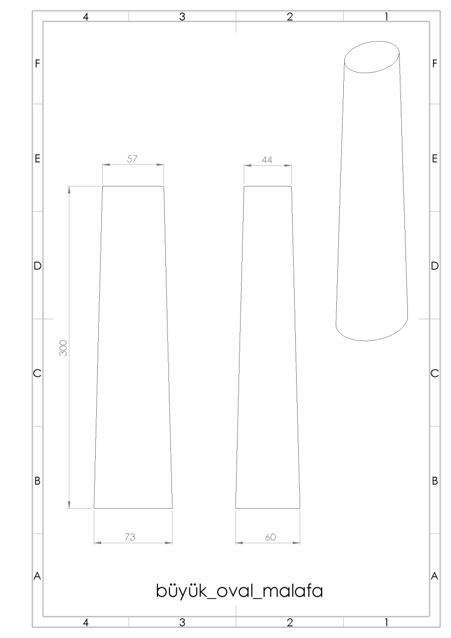 büyük boy malafa küçük çap 60 x 50 mm , büyük çap 75 x 60 mm , boyu 300 mm konik dir.