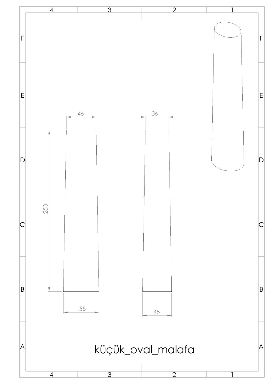 küçük boy malafa küçük çap 50 x 45 mm , büyük çap 60 x 50 mm , boyu 250 mm konik dir.